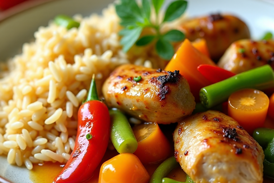 Un plat réconfortant qui associe tendres morceaux de poulet, légumes frais, riz parfumé et une délicieuse sauce acidulée à l’orange.